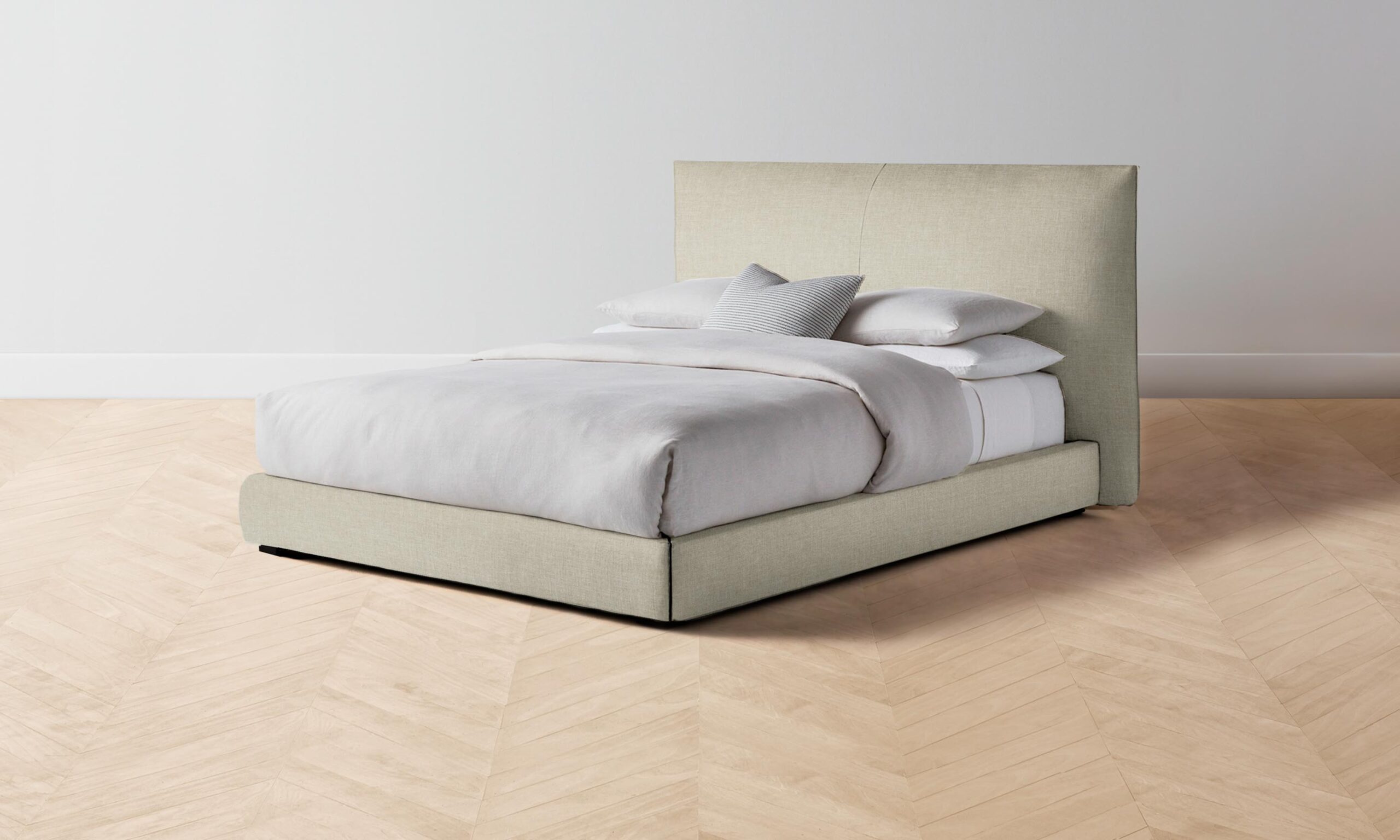 The Wythe bed achieves a perfect balance of ease and sophistication. It features a laid-back, low profile and extended headboard traced with flange seams.