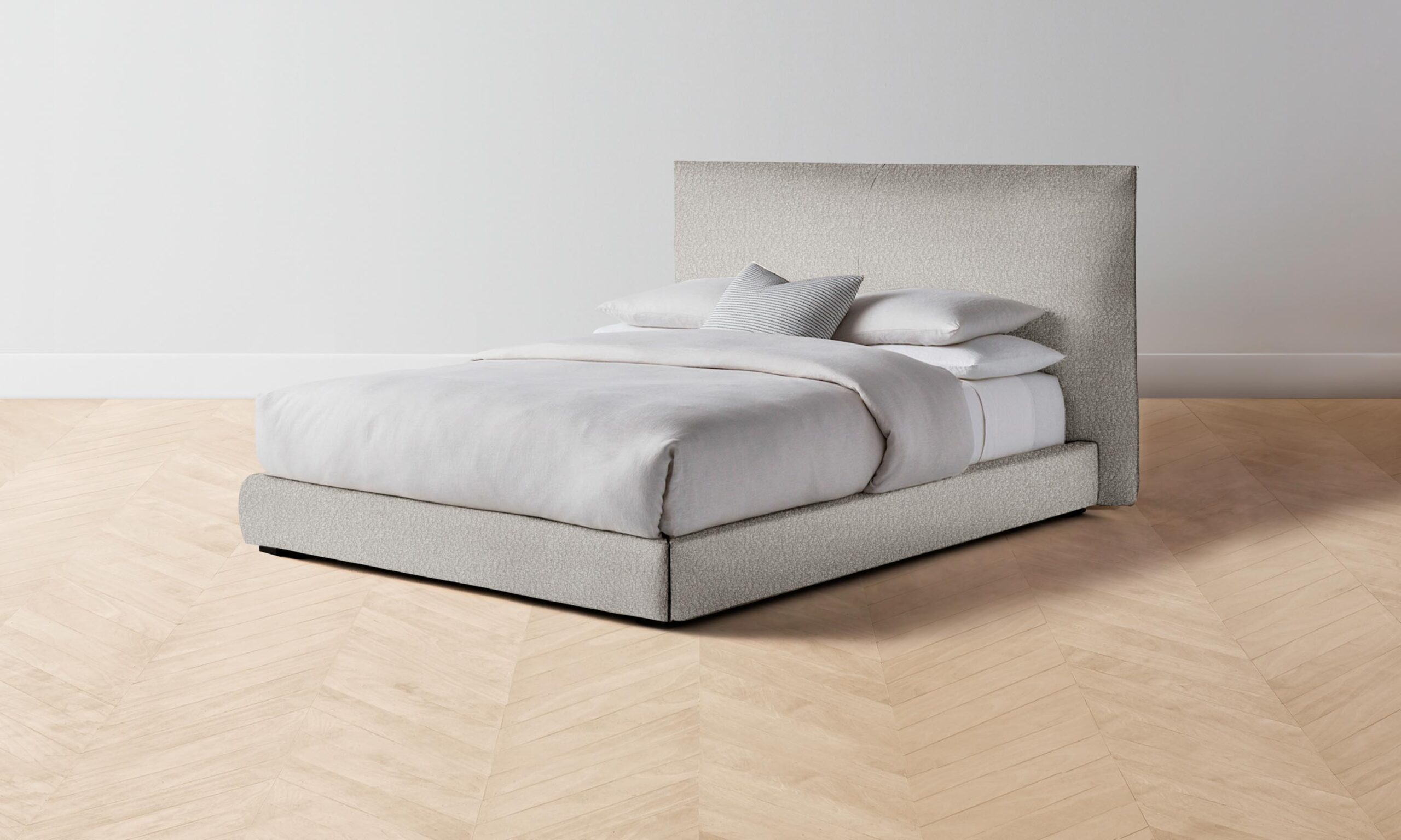 The Wythe bed achieves a perfect balance of ease and sophistication. It features a laid-back, low profile and extended headboard traced with flange seams.
