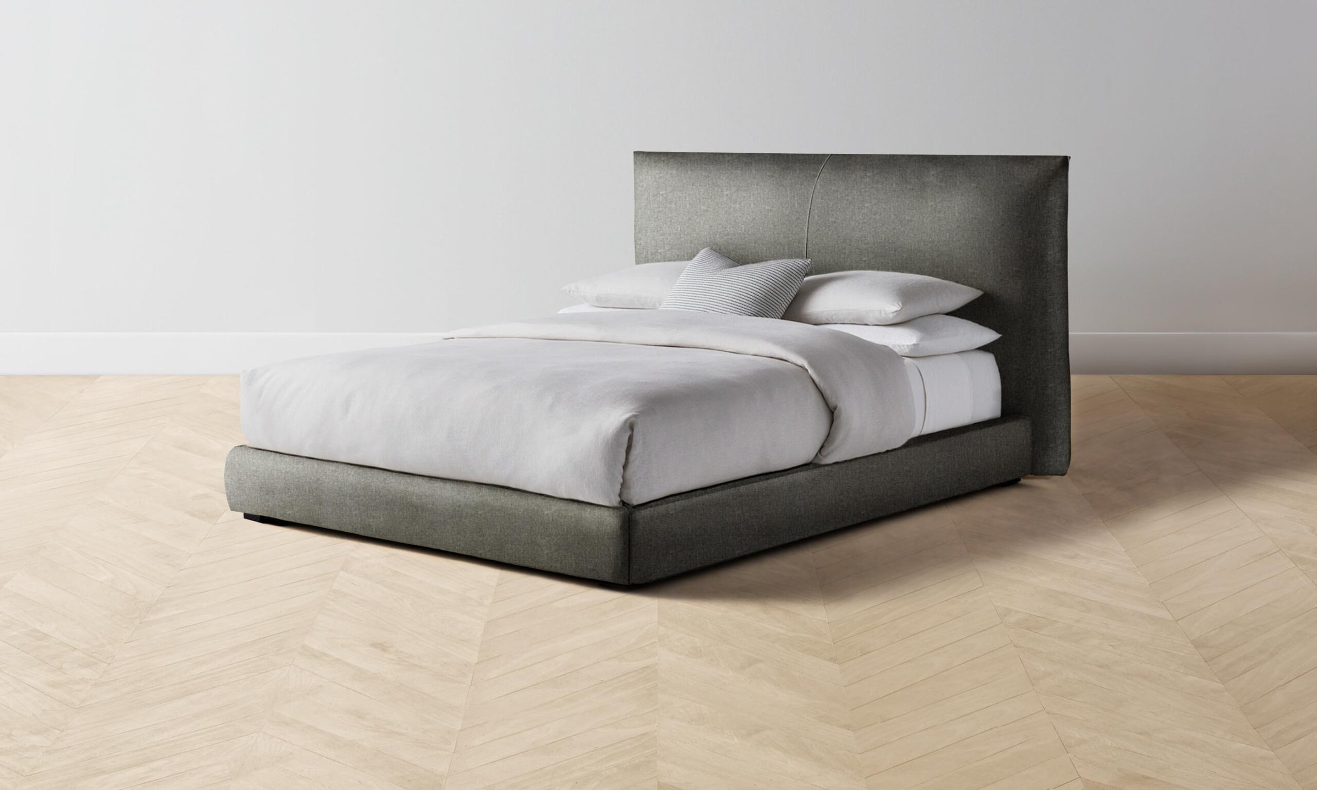 The Wythe bed achieves a perfect balance of ease and sophistication. It features a laid-back, low profile and extended headboard traced with flange seams.