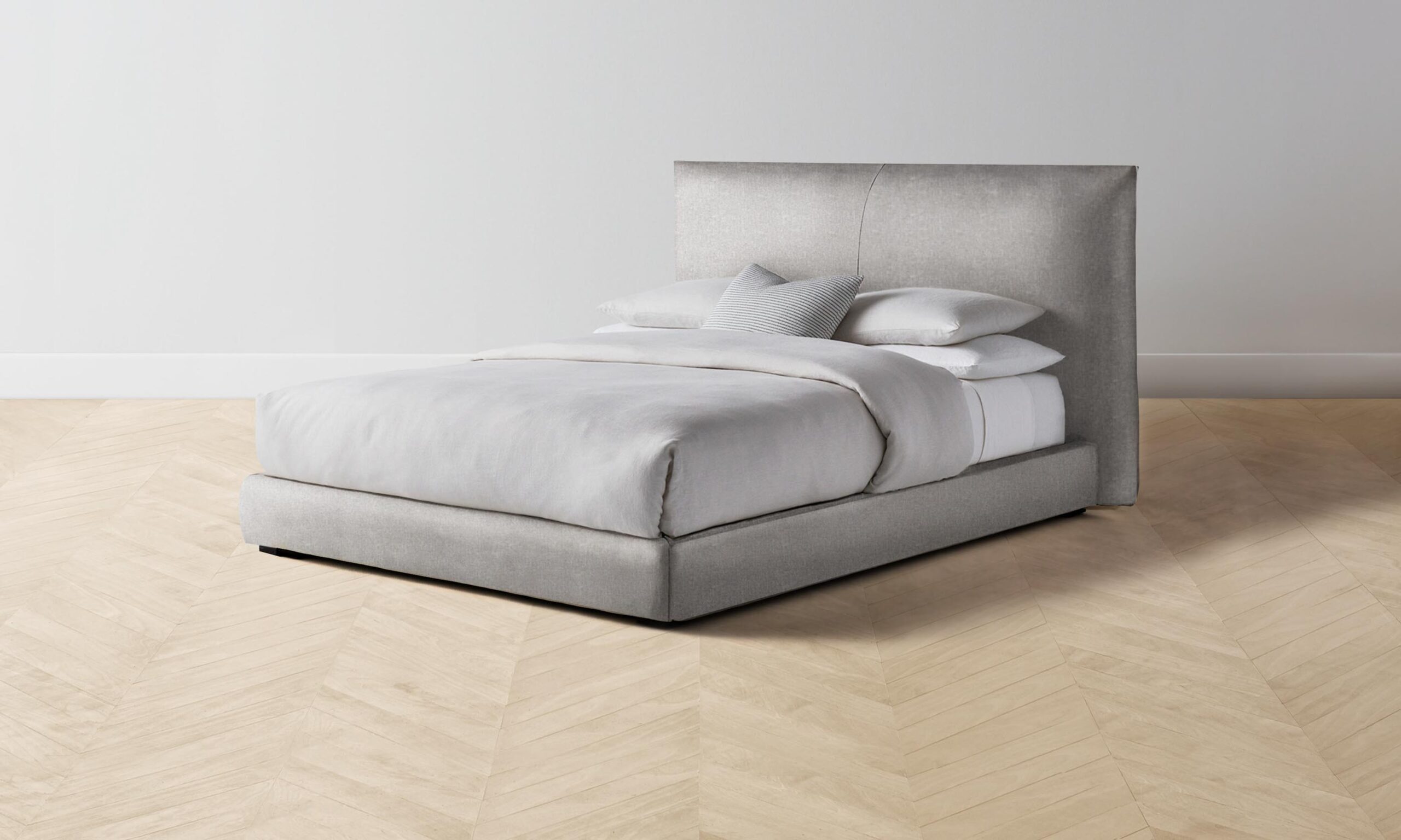 The Wythe bed achieves a perfect balance of ease and sophistication. It features a laid-back, low profile and extended headboard traced with flange seams.