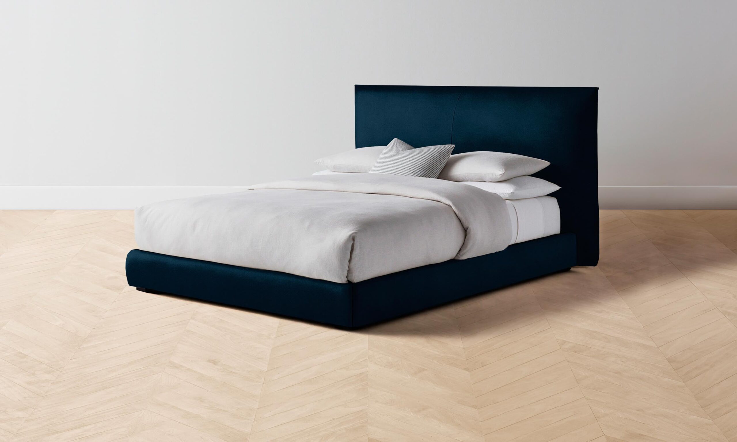 The Wythe bed achieves a perfect balance of ease and sophistication. It features a laid-back, low profile and extended headboard traced with flange seams.