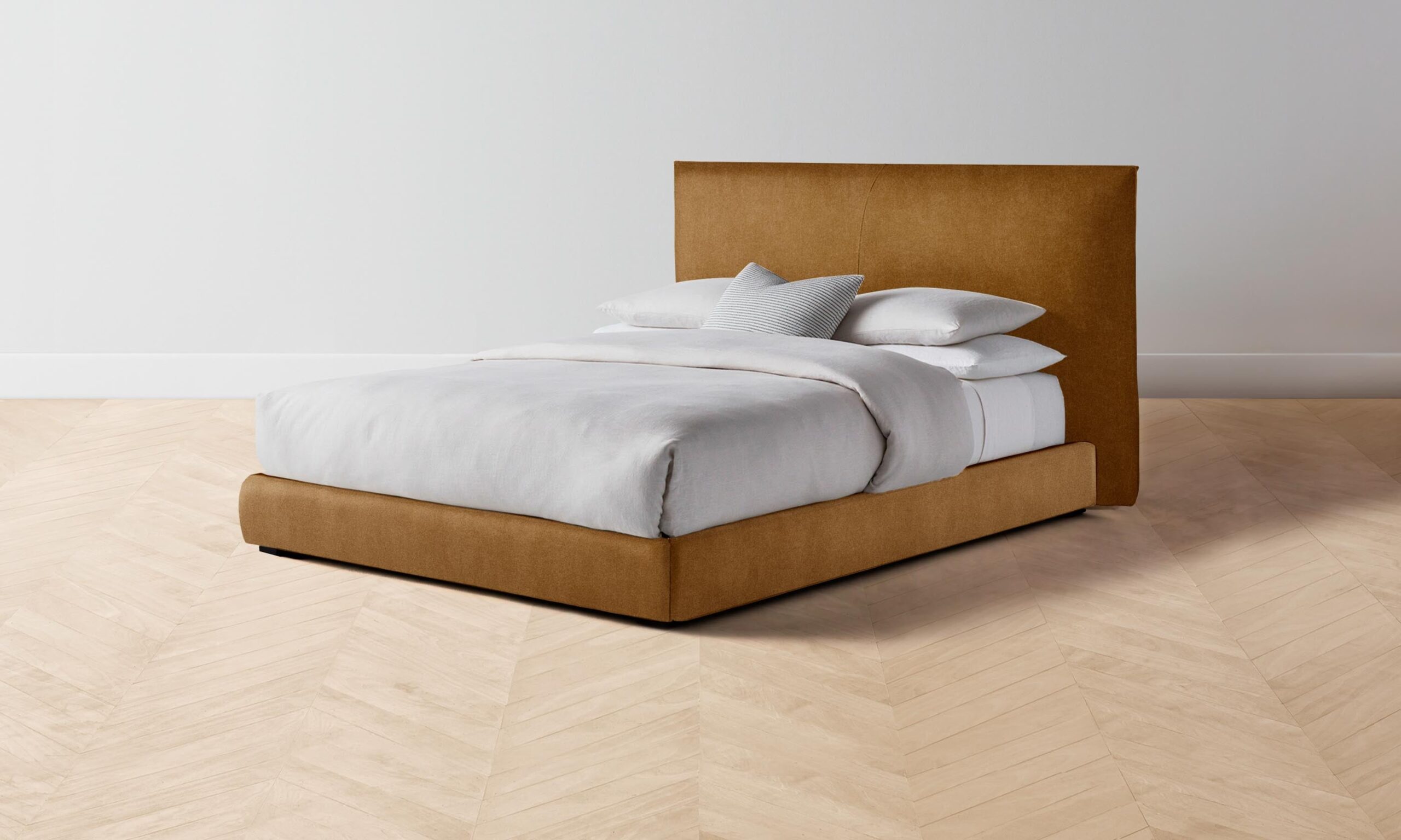 The Wythe bed achieves a perfect balance of ease and sophistication. It features a laid-back, low profile and extended headboard traced with flange seams.