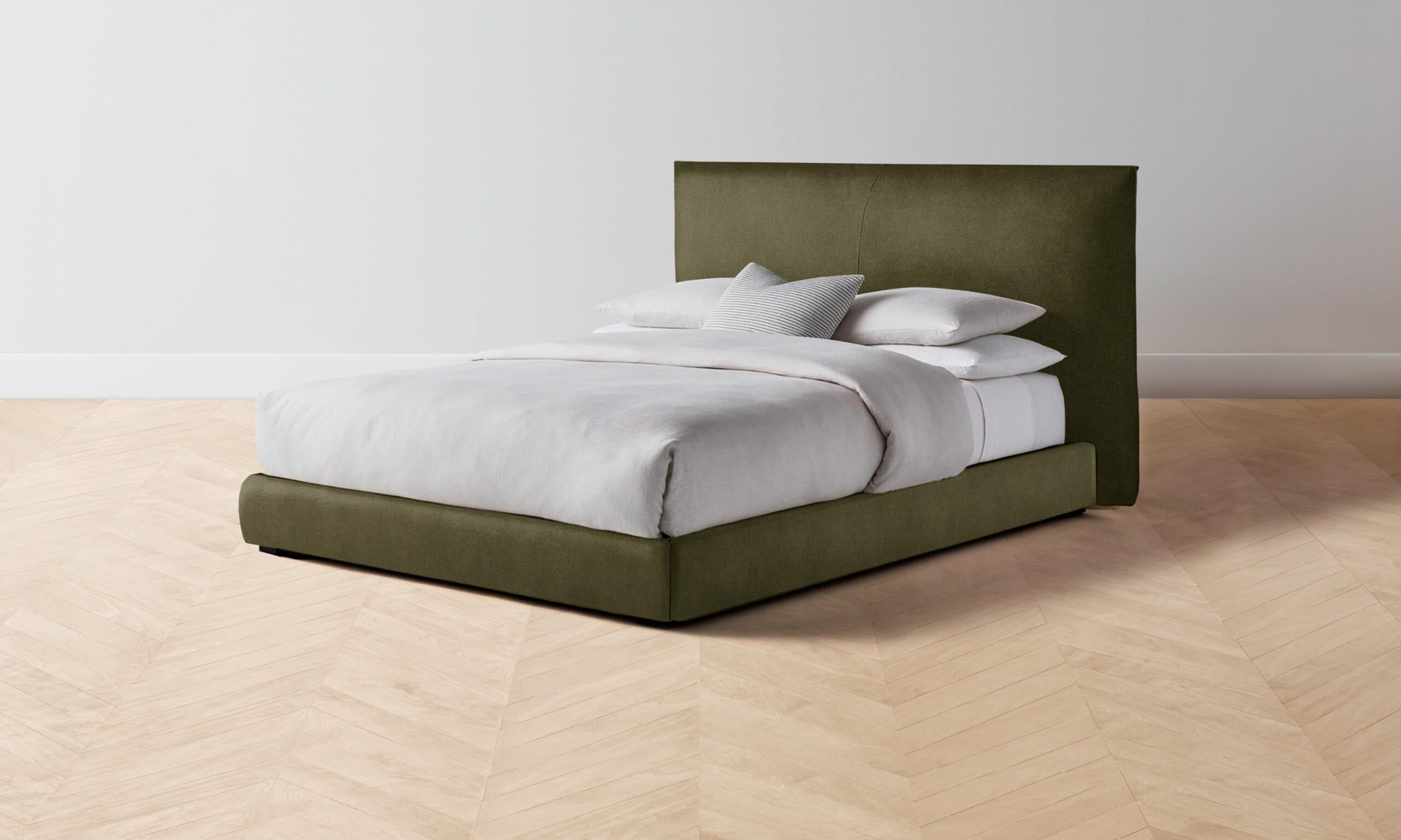 The Wythe bed achieves a perfect balance of ease and sophistication. It features a laid-back, low profile and extended headboard traced with flange seams.