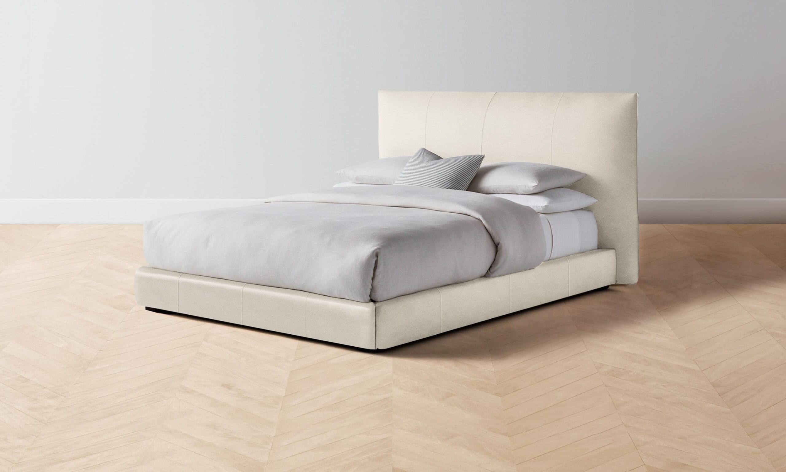 The Wythe bed achieves a perfect balance of ease and sophistication. It features a laid-back, low profile and extended headboard traced with flange seams.