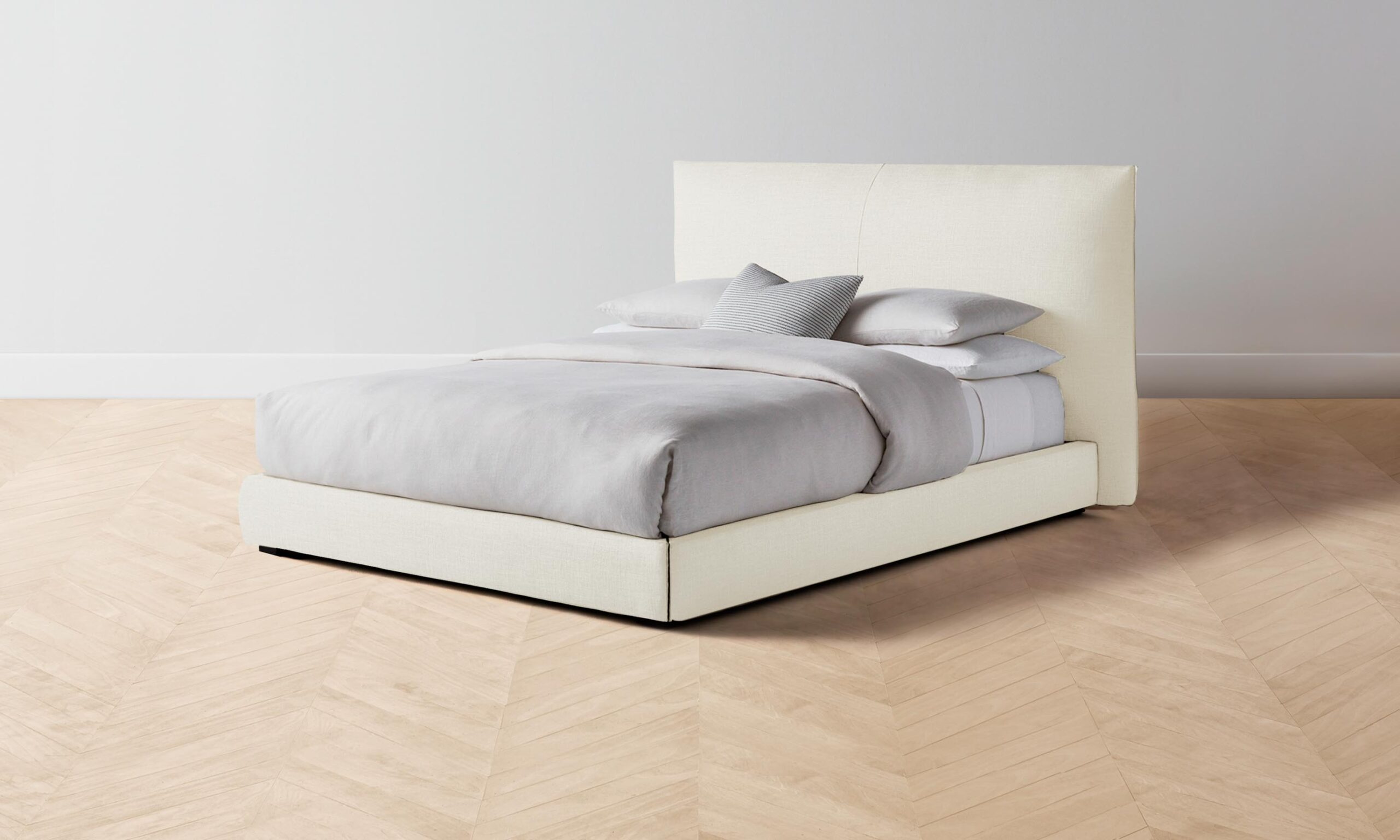 The Wythe bed achieves a perfect balance of ease and sophistication. It features a laid-back, low profile and extended headboard traced with flange seams.