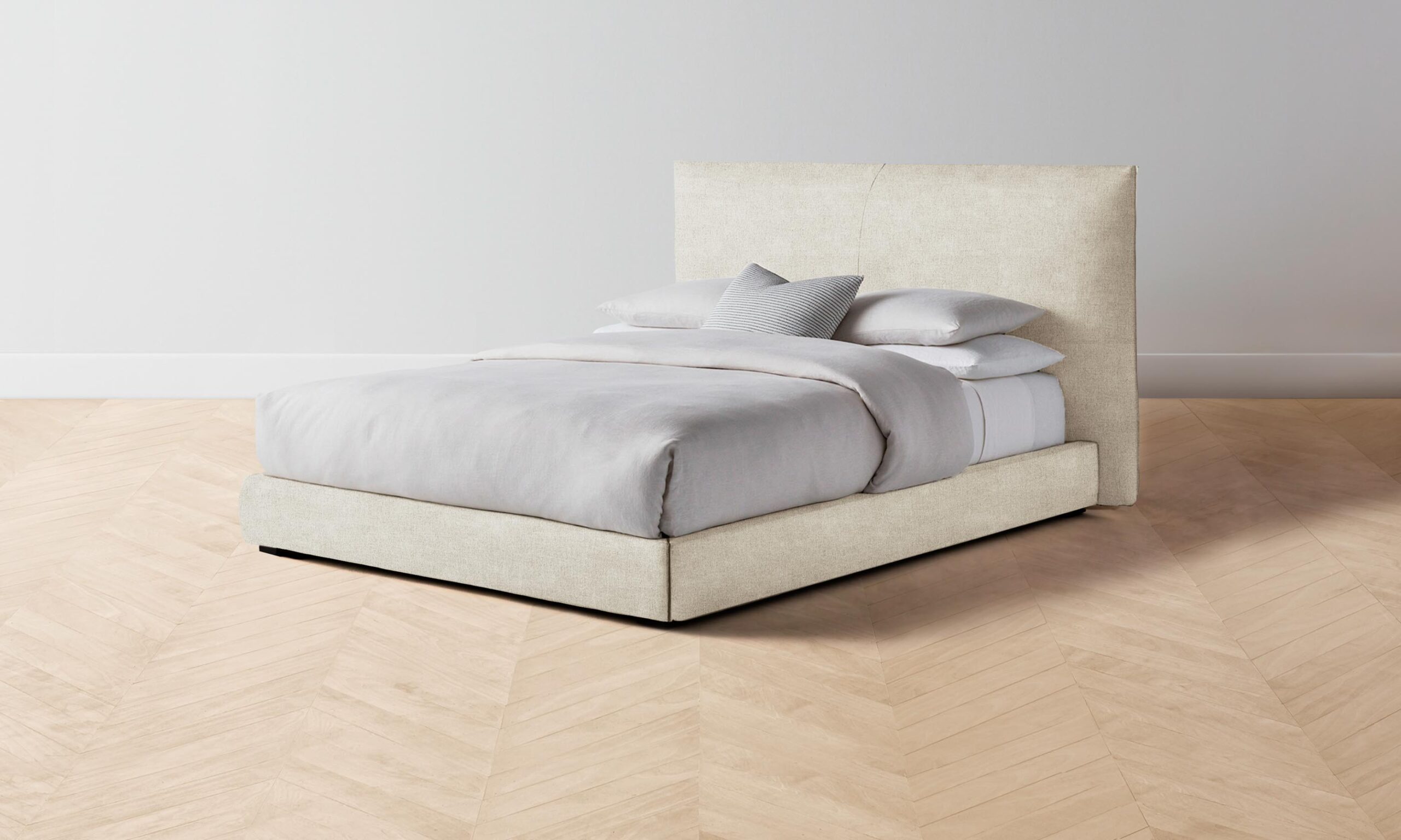 The Wythe bed achieves a perfect balance of ease and sophistication. It features a laid-back, low profile and extended headboard traced with flange seams.