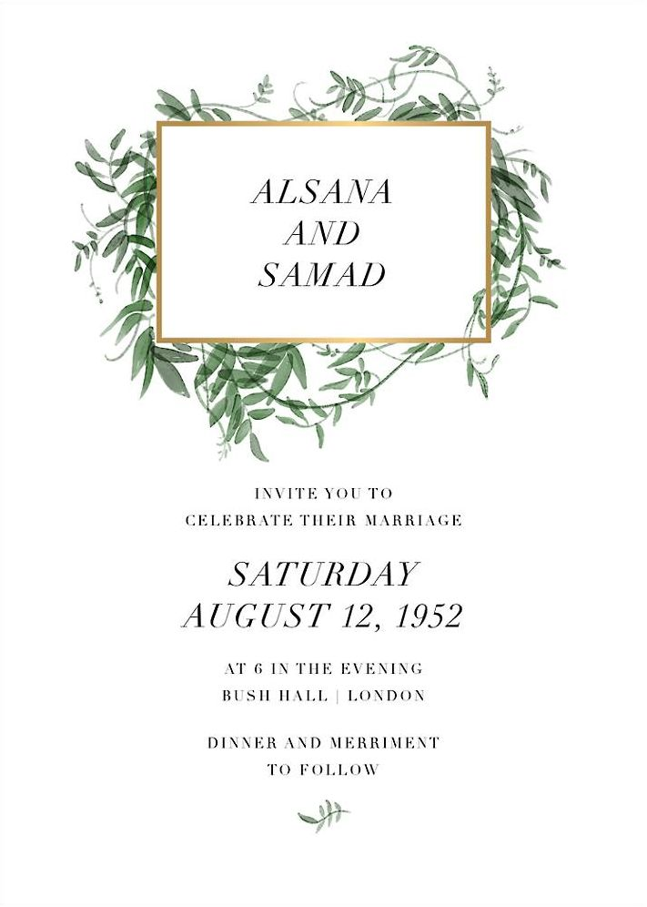 Chic, modern typesetting is complemented by lush greenery twining around golden foil on the Thirlmere Foil Wedding Invitation, designed by Paperless Post.