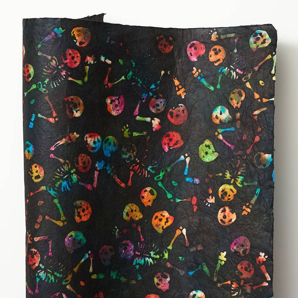 Create a unique wrap or craft project featuring this tie die Halloween Skeleton design on black handmade paper. Made from the renewable fibers of the Lokta plant, this fine paper is also a green choice for your projects!