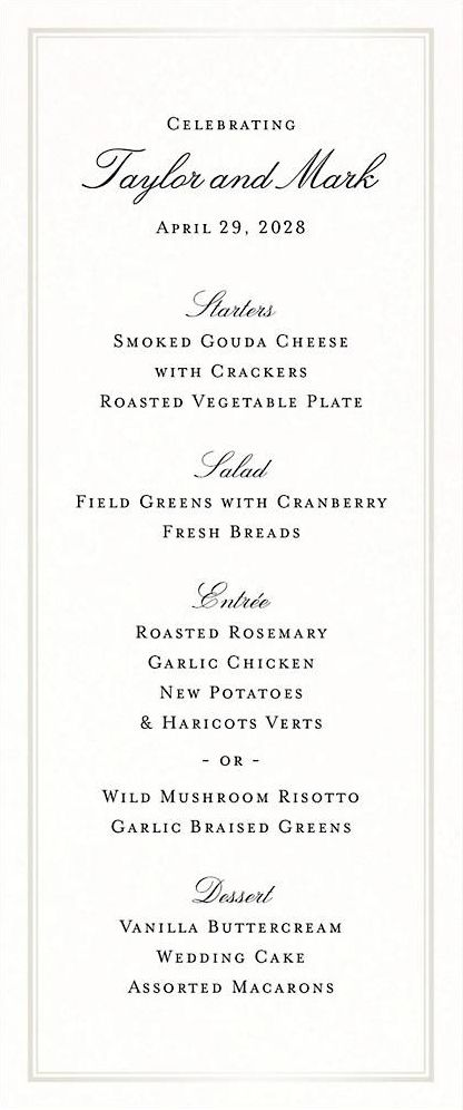 Pair these menus with your Timeless Elegance invitation suite, or mix and match to your style from any suite in our wedding collection. Printed on Mohawk superfine white 130 lb. card stock that is soft to the touch and matches our superfine white envelopes. This paper is FSC certified, with 30% post consumer recycled content, and made using wind power. This design was created by our in-house designers at Paper Source.
