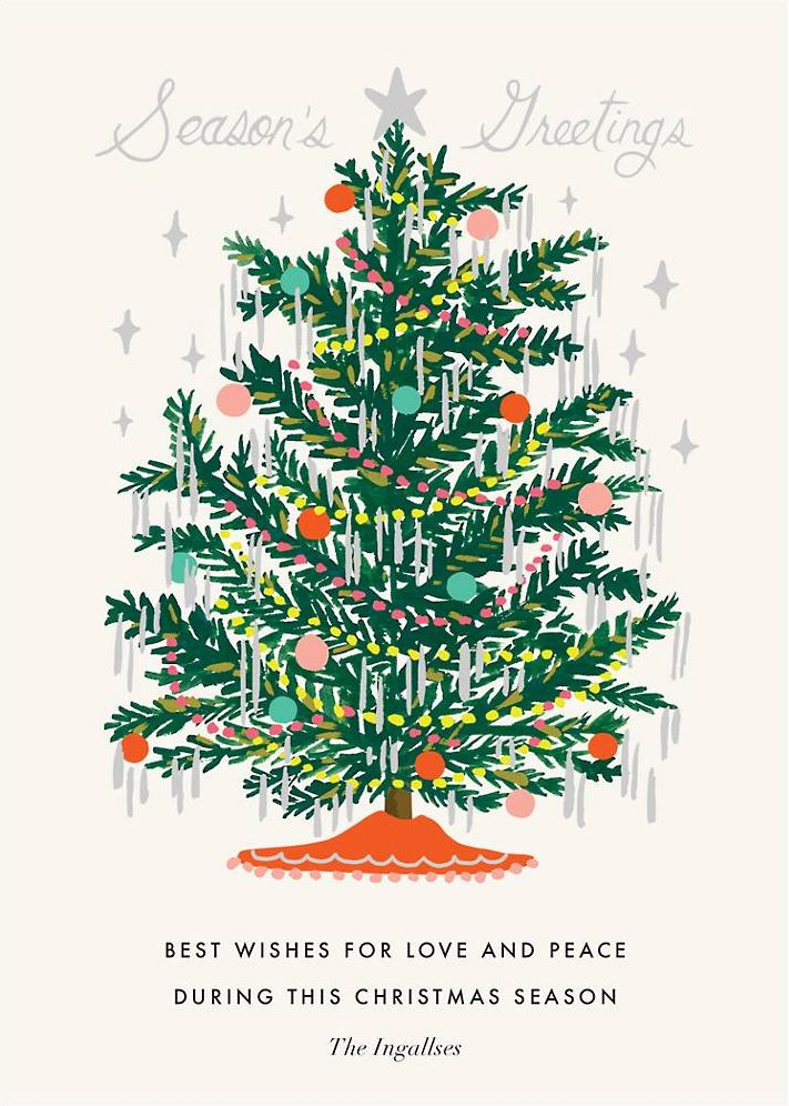 A spectacularly decorated Christmas tree takes centerstage on this customizable card, with beautiful artwork from the designers at Rifle Paper Co. for Paperless Post Be sure to check out photo options for the back of this card!