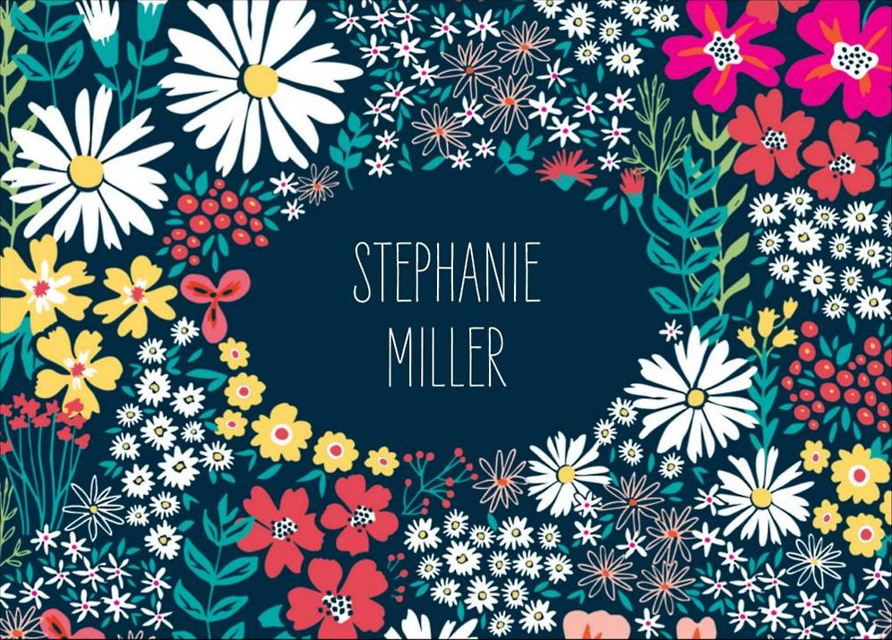 Colorful array of blossoms surrounding your name pair perfectly with the sweet typography to create a bold and vibrant look. Printed on superfine white paper, which has a smooth finish and is soft to the touch. 100# cover weight paper with 30% post consumer recycled content. Cards ship flat, and are scored for easy folding.