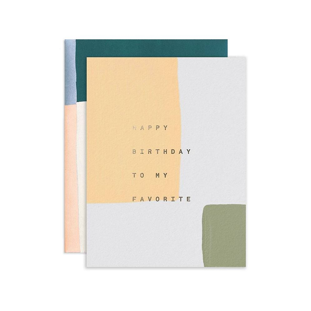 This beautiful card is perfect to send for a birthday! Front reads, “Happy birthday to my favorite.” Each card has a unique abstract design. Paired with a patterned envelope. Folded card. Blank inside. From Moglea.