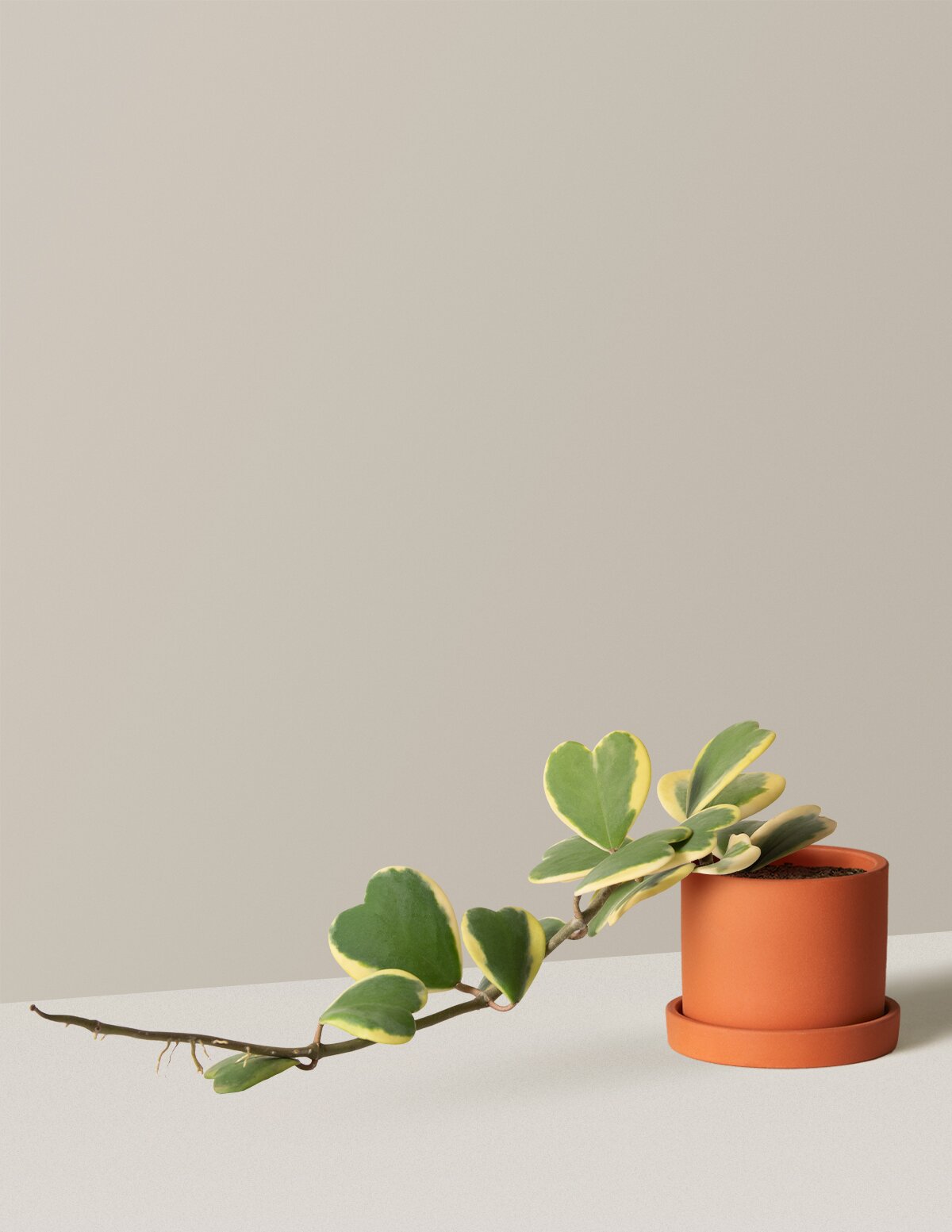 The Hoya kerrii is commonly often referred to as the Heart-Leaf Hoya because of its leaves. This variation has a creamy-yellow variegation, and is a “complete” plant (as opposed to the Hoya Heart, which is a single-leaf cutting), so it will grow trailing vines. A member of the succulent family, this plant likes dappled sun and dislikes “wet feet” — let it dry out between waterings.