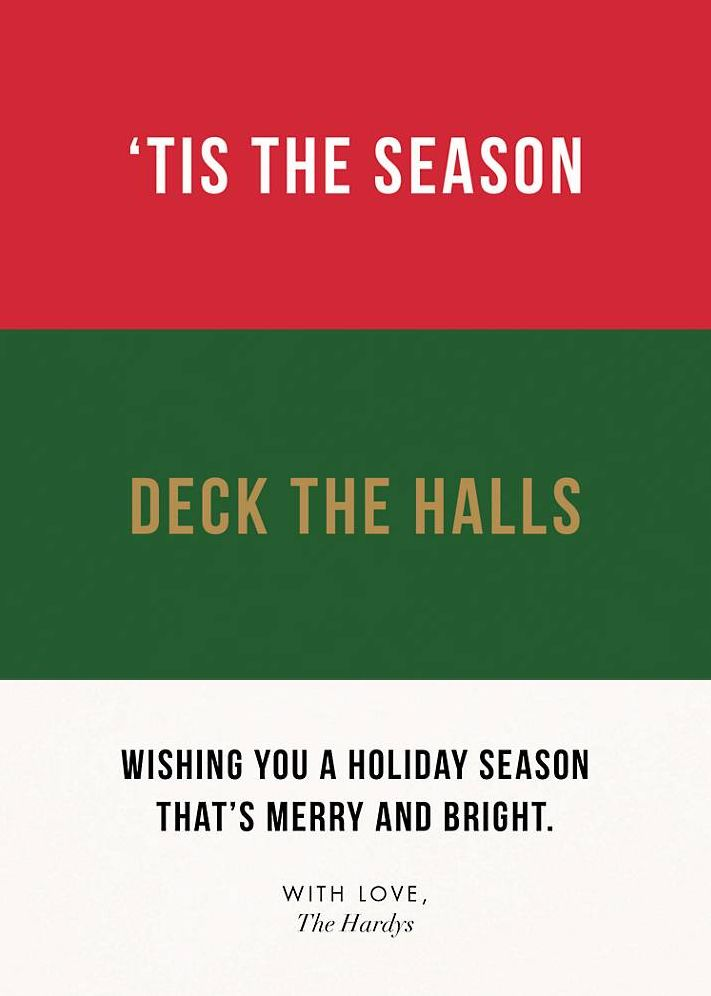 Let those you love know that you’re thinking of them with this personalized holiday card from kate spade new york by Paperless Post. This card reads “‘Tis the Season, Deck the Halls” and can be further customized with a message from you and your family. Printed on Mohawk ultra white 120 lb. card stock that is soft to the touch and matches our superfine white envelopes. Paper is FSC certified and made using wind power.