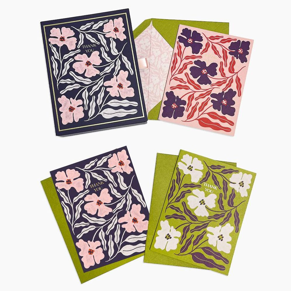 These funky floral cards are a fun way to say thank you! Assorted set contains three thank you notes and features 12 cards total. Blank inside. Paired with matching envelopes. Designed by Paper Source.