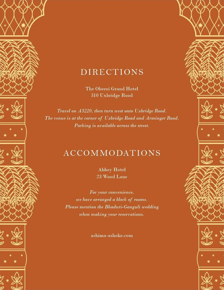 The Vinayaka Information Card features an ornate design on its edges, with your wedding details at its center. Designed by Paperless Post. Printed on Mohawk superfine white 130 lb. card stock that is soft to the touch and matches our superfine white envelopes. Paper is FSC certified and made using wind power.