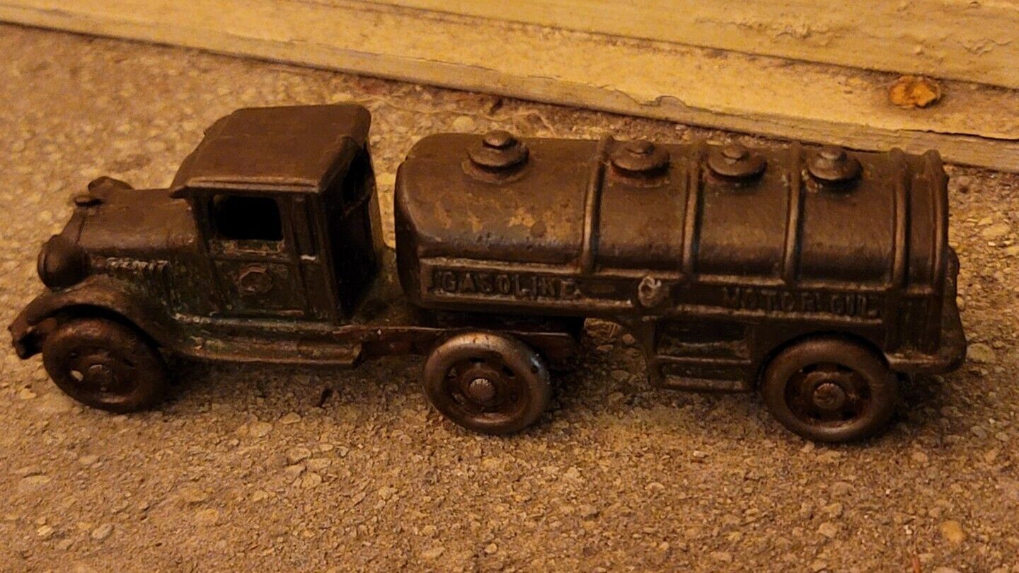 VINTAGE 1930S CAST IRON TOY TRUCK AND TRAILER GASOLINE AND MOTOR OIL