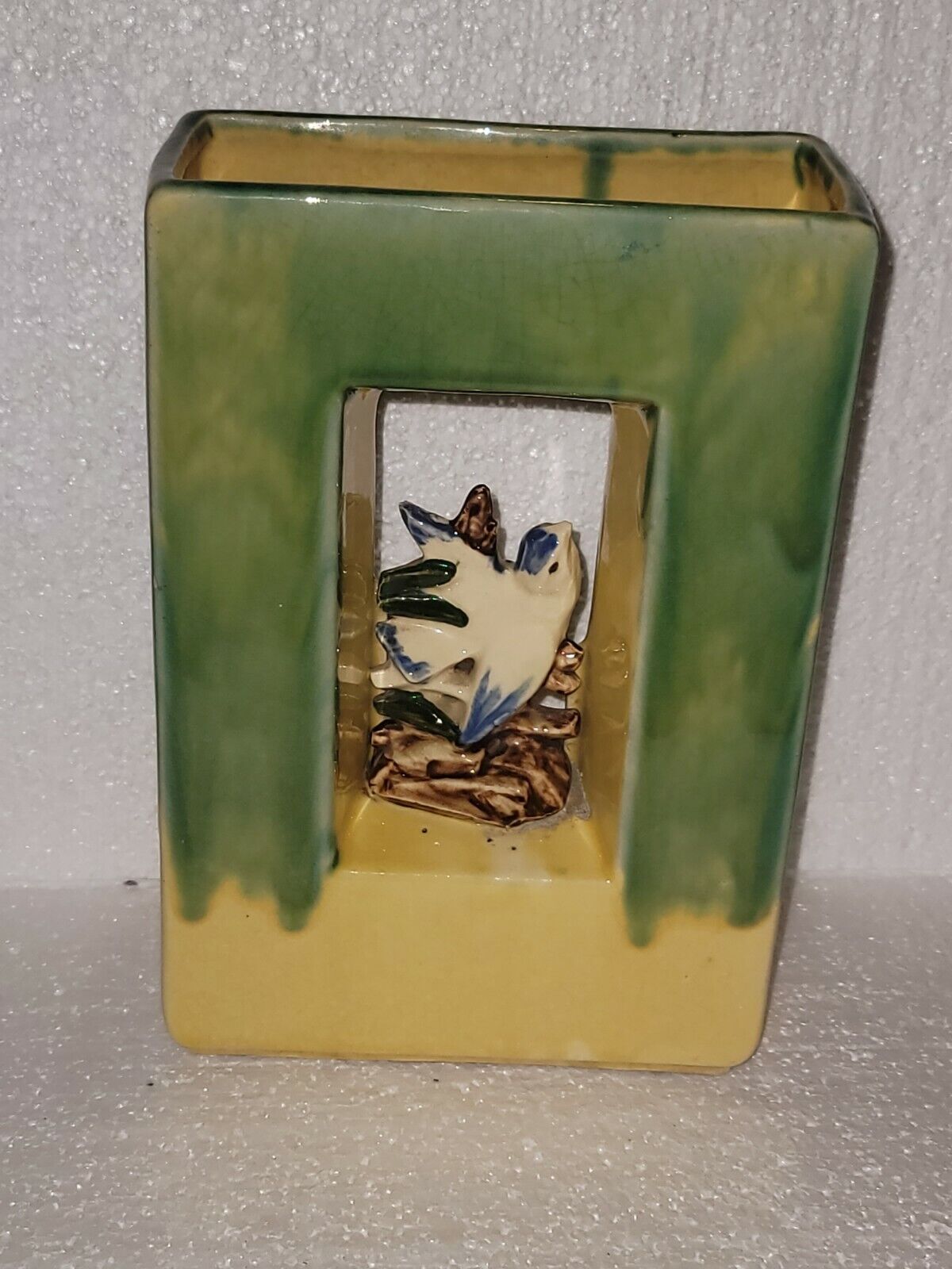 VINTAGE 1951 RARE McCOY POTTERY ARCATURE YELLOW & GREEN 9″ X 6″ DOUBLE BIRD VASE.