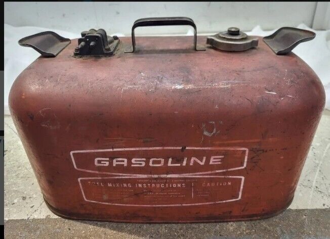 VINTAGE 6 GALLON outboard metal GAS FUEL TANK CAN OMC marine Outboard Marine USA. Please use the pictures as part of the description and ask any questions you may have. Looks to be in okay used condition may need cleaning.
