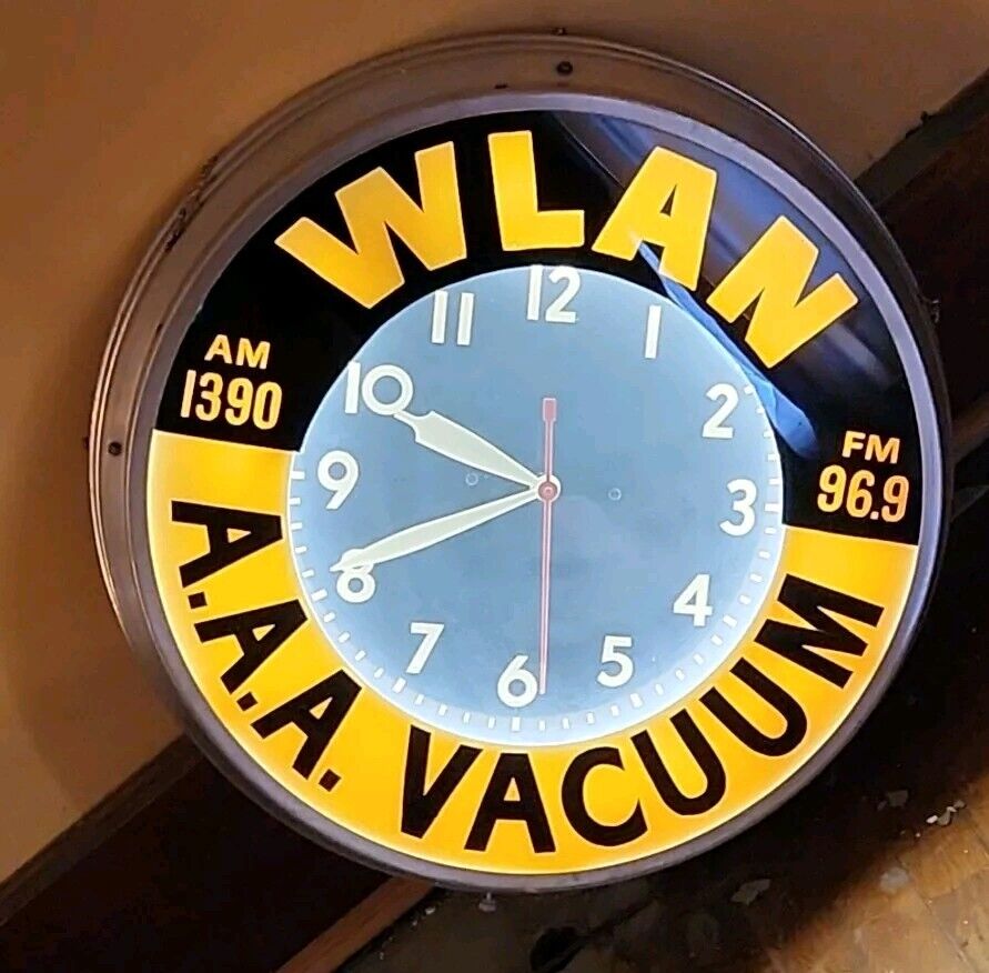 Vintage A.A.A. Vacuum WLAN Radio WALL CLOCK MCM Electric Advertising Runs 21″