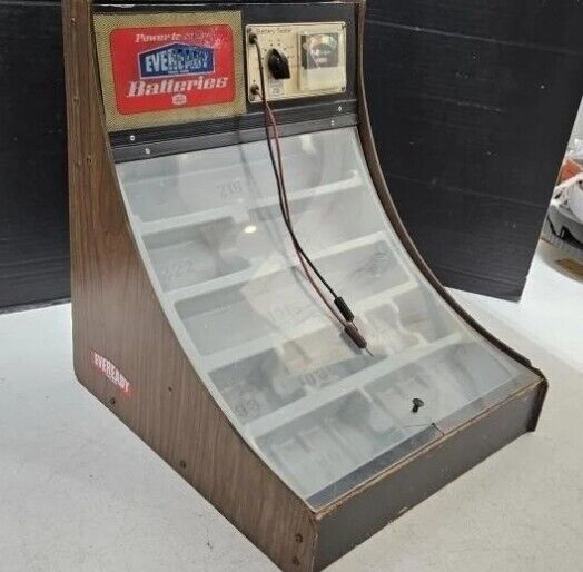 This is a vintage store display stand for Eveready batteries, made of wood and in working condition. It features a battery tester and has a charming 1960s design. The brand is Eveready and it was made in the United States. This collectible item would make a great addition to any advertising or merchandise collection. The unit type is a unit and it is perfect for displaying in a store or at home. The color is wood and it has a type of advertising for display stands. The date of creation is around the 1960s, making it a true vintage piece.