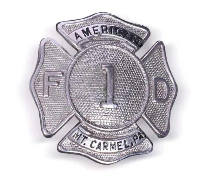 Vintage Fire Department Metal Badge Mt. Carmel 1 Pennsylvania. Please use the pictures as part of the description and ask any questions you may have.