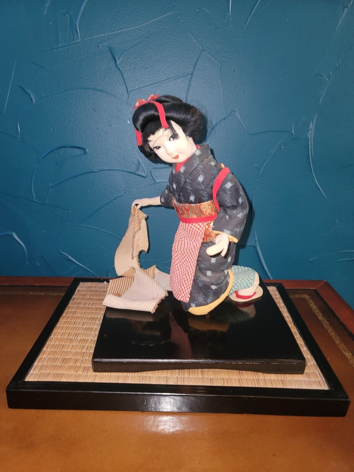 Vintage Japanese 10″ Ichimatsu Girl Doll In Elaborate Kimono Wood Base.