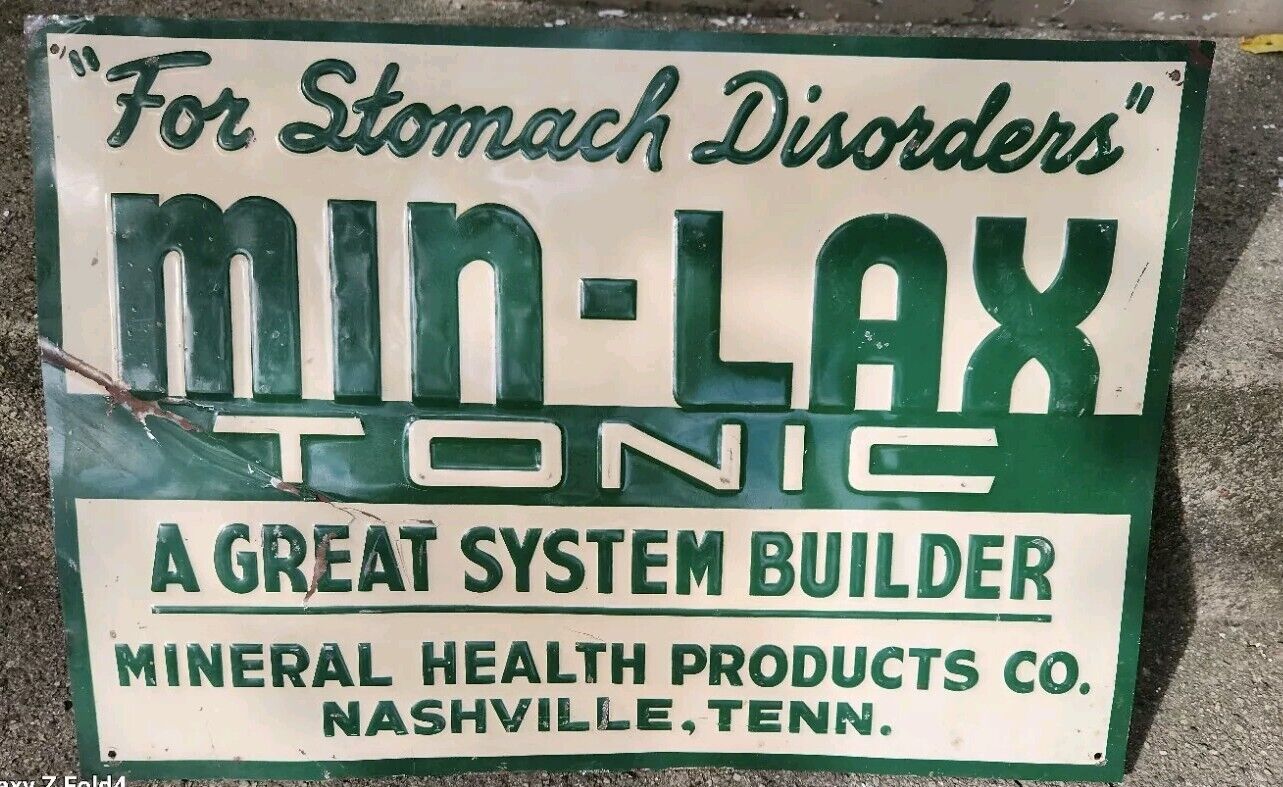 Vintage Min-Lax Tonic Embossed Tin Sign Measures 20′ Across General Store Farm B