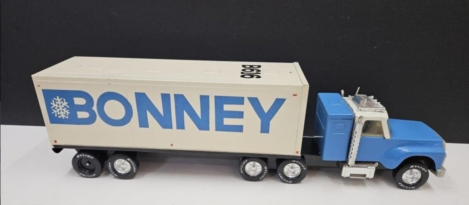 This vintage Nylint Bonnie 18 Wheeler toy semi truck tractor trailer is a must-have for any collector or enthusiast of diecast and toy vehicles. With its 1:8 scale and iconic design, this truck is sure to turn heads and deliver endless hours of fun. Made in 1986, this classic collectible is perfect for reliving memories of childhood or adding to a curated collection of vintage toys.