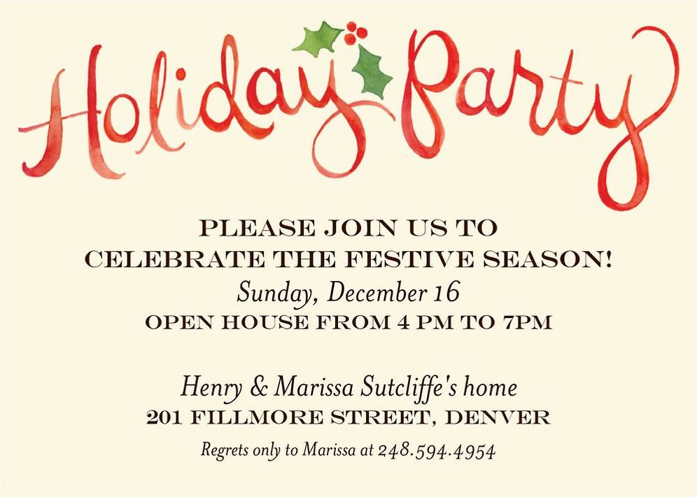 Beautiful hand-watercolored script lettering and holly sprigs are so pretty and festive on this holiday party invitation – perfect for any holiday fete! Printed on Mohawk ultra white 120 lb. card stock that has a smooth finish and is soft to the touch. Paper is FSC certified and made using wind power.