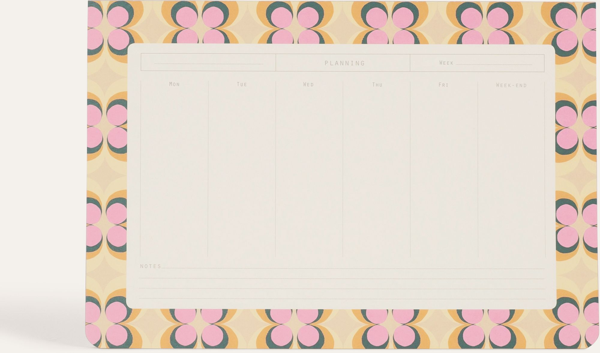 The butterflies with psychedelic geometric wings of our Battement pattern will transport you straight into the seventies. With its 52 detachable pages, this weekly planner will allow you to organize yourself throughout the year.