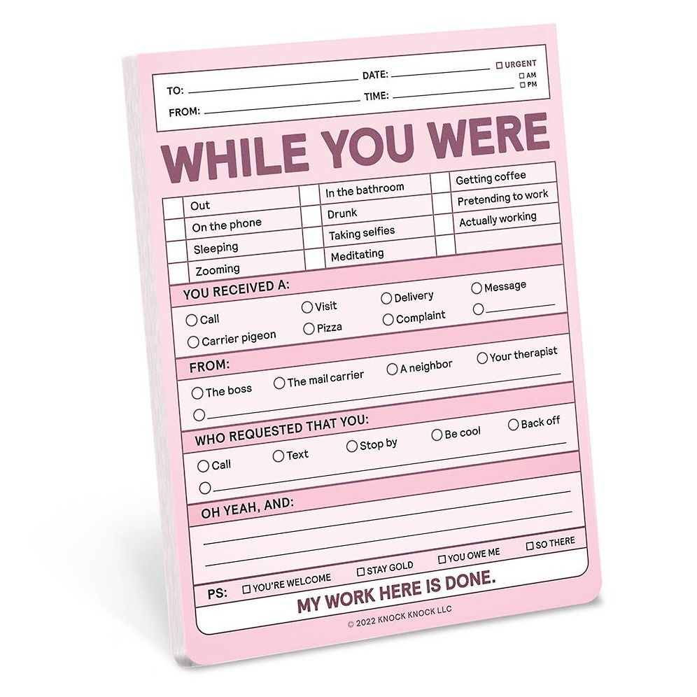 When you have a memo for someone who’s away from their desk/recliner/barstool, this while you were out message pad is just the ticket! With old school charm and new-school wit, it conveys your message and busts them at the same time!¬†