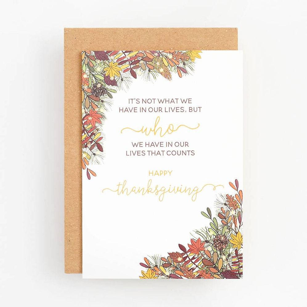 Designed by one of England’s leading publishers, this festive greeting card reads “It’s now what we have in our lives, but who we have in our lives that counts. Happy Thanksgiving.