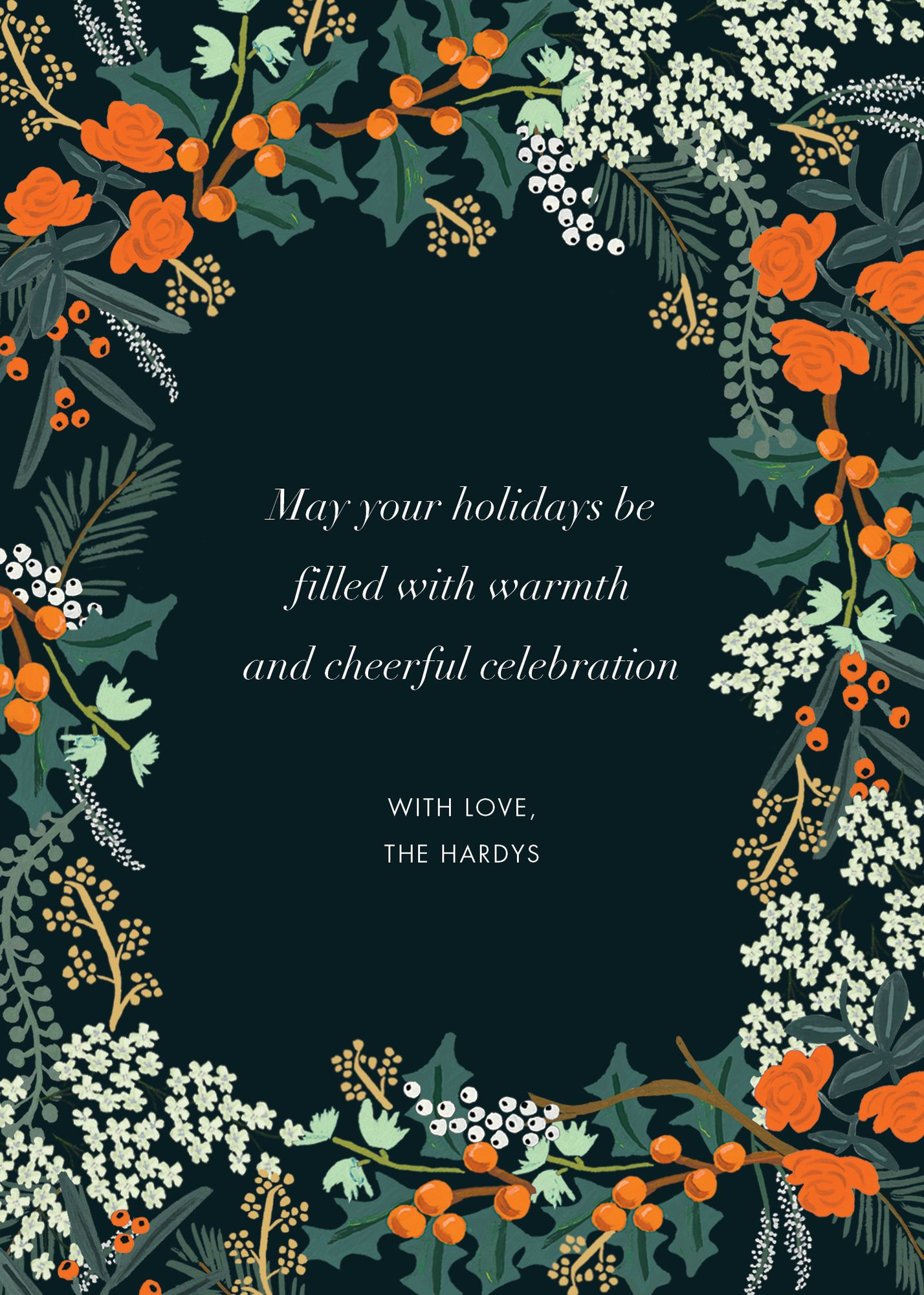 Whimsical florals and greenery from Rifle Paper Co. for Paperless Post make the sweetest holiday card. Printed on Mohawk ultra white, 120 lb. card stock that is soft to the touch and matches our superfine white envelopes. Paper is FSC certified and made using wind power.