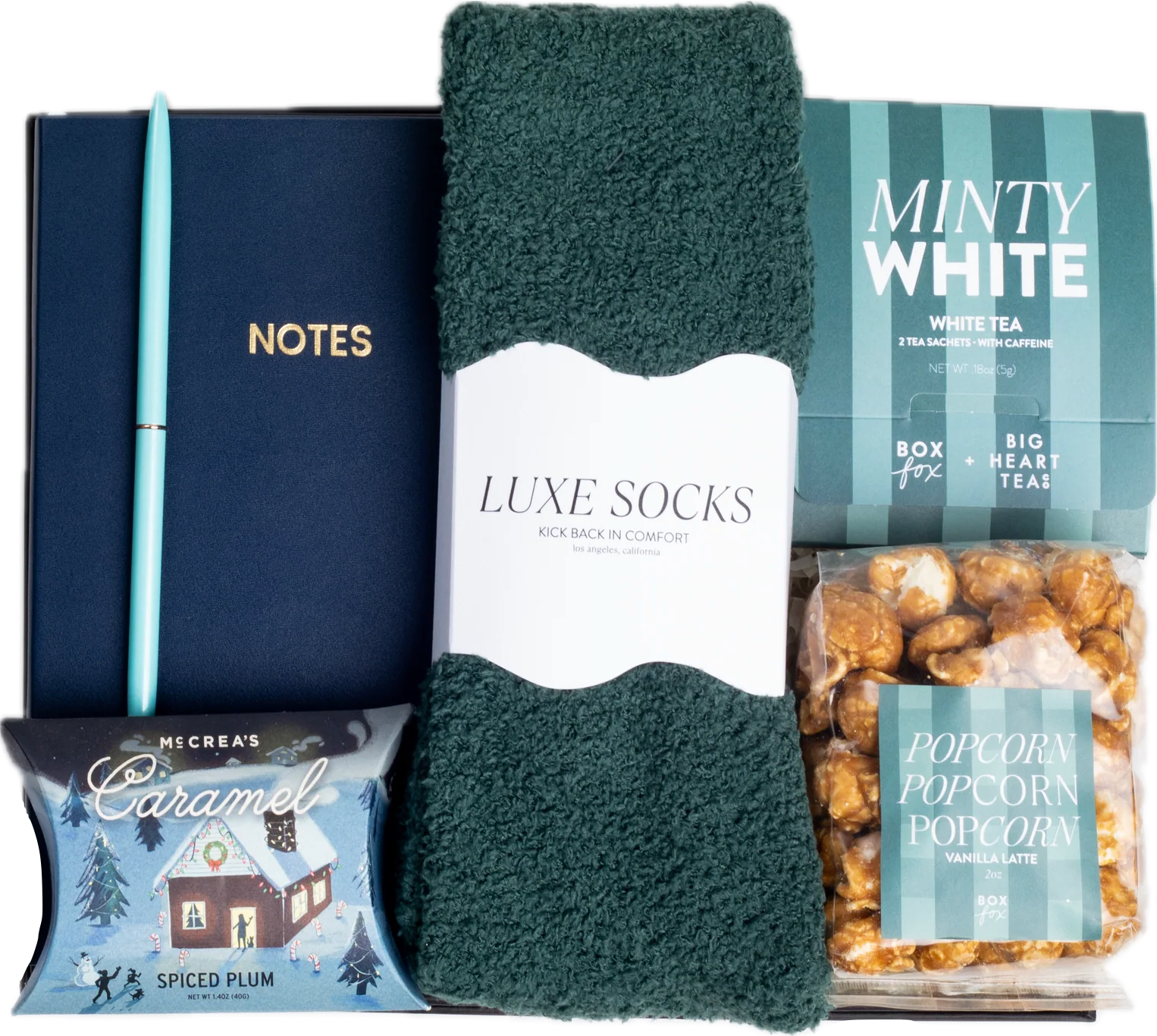 This gift is filled with all the essentials to get you through the winter season, including cozy socks, minty tea, sweet treats, and a journal to help keep you on track for your 2025 goals.