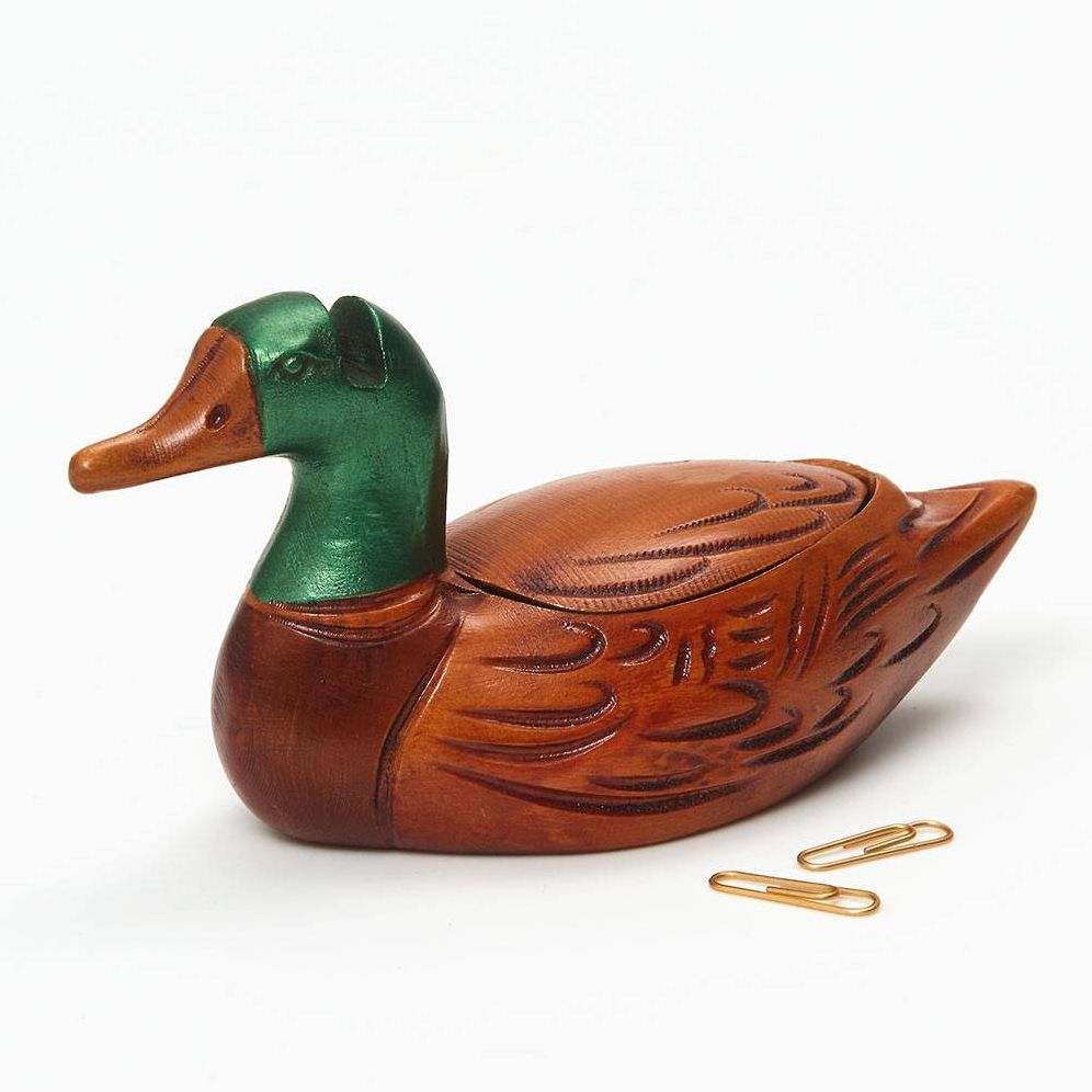 Add this functional Duck Decoy to an office or bedroom for hidden storage. It’s made of wood, with removable lid and storage for glasses.