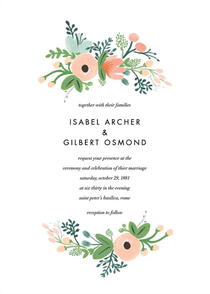 Send out adorable wedding invitations to get your guests excited for your big day. This Rifle Paper Co. for Paperless Post design is wrapped in wildflowers featuring florals in peachy pink tones with accents of greens. Printed on superfine white paper, which has a smooth finish and is soft to the touch. 130# cover weight paper with 30% post consumer recycled content.