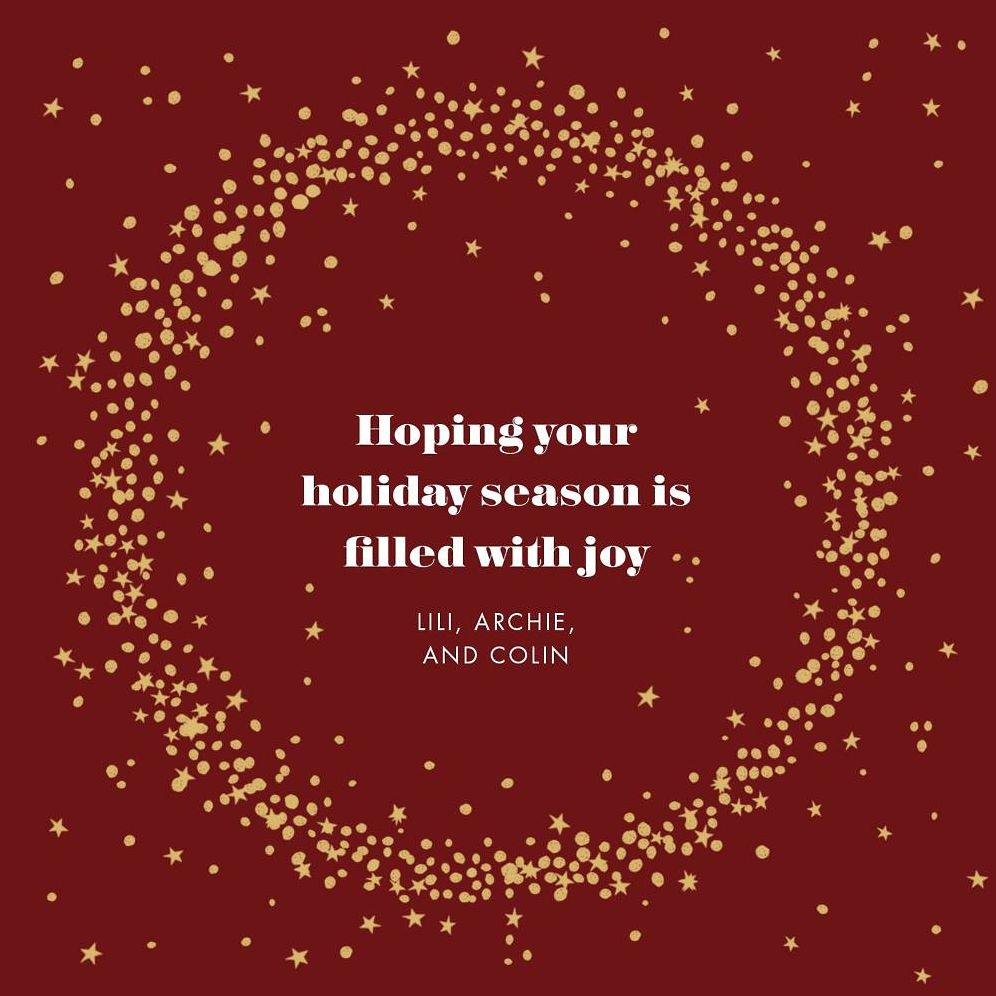 Frame your holiday well wishes in a gold and starry wreath with your choice of color for the background on this customizable card from Paperless Post.