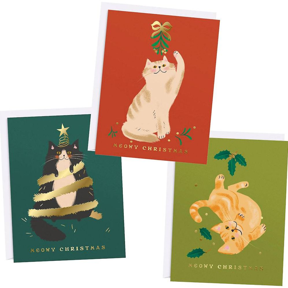 Features a set of 12 Christmas correspondence notecards with three different cat designs & foil details.
