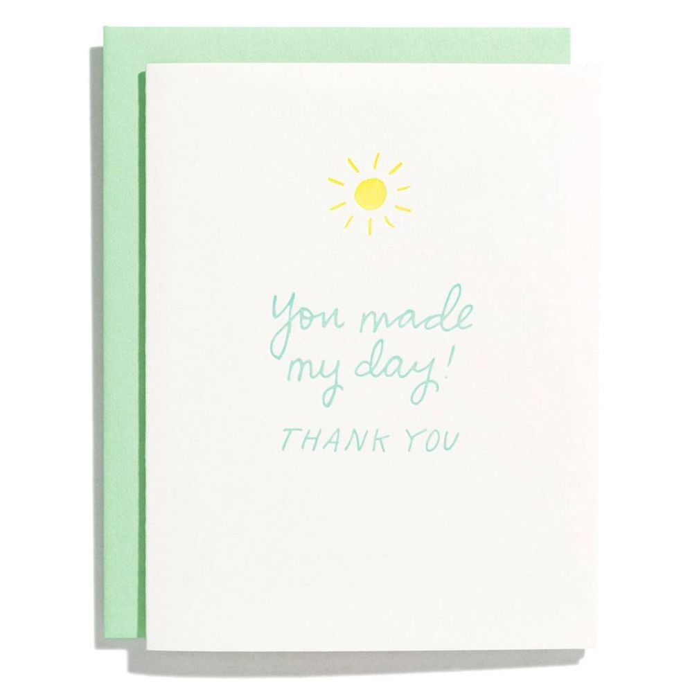 Don’t forget to share your gratitude. Letterpress card reads, “You made my day! Thank you!” Blank inside. Paired with coordinating envelope. By Iron Curtain.