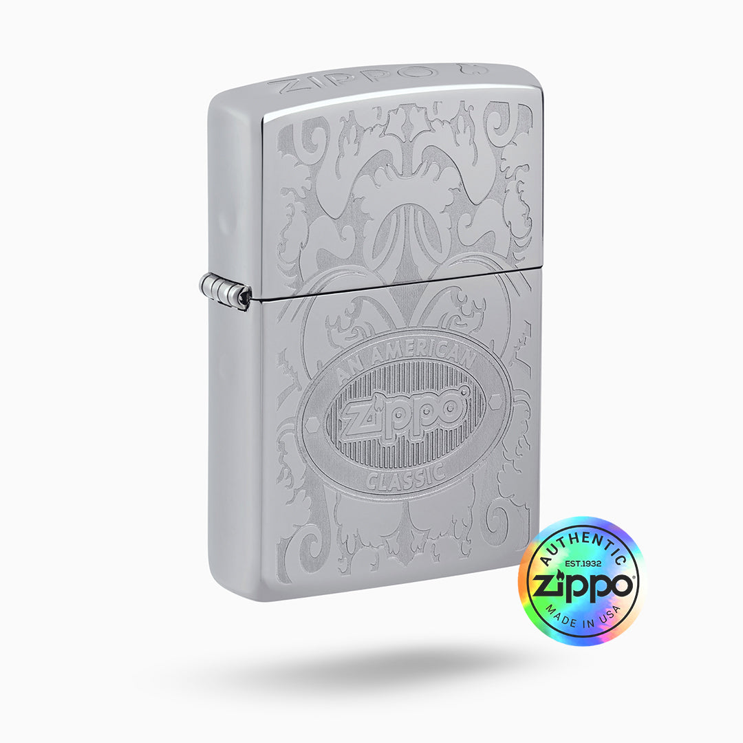 Experience sophistication and style with the Zippo Crown Stamp™ Design. The elegant filigree design showcases the iconic Zippo logo on the lid. With the use of the double lustre imprint method, this High Polish Chrome lighter exudes luxury and class.