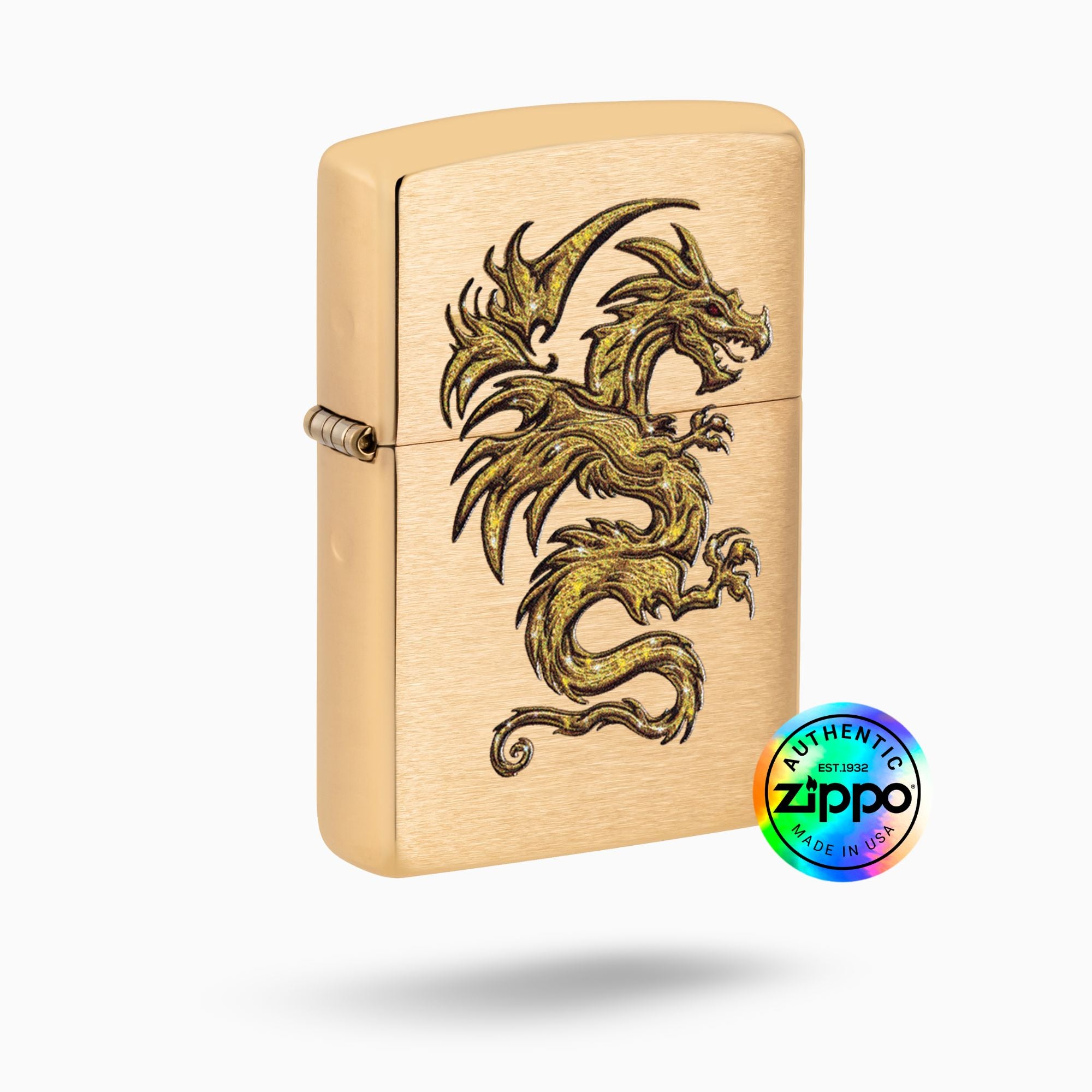 Unleash the power of the Zippo Dragon Windproof Lighter. Embrace the boldness of the sparkling golden dragon design on a Brushed Brass finish. Escape from reality and light up your destiny with this essential tool. Fuel your fire and conquer any challenge that comes your way!