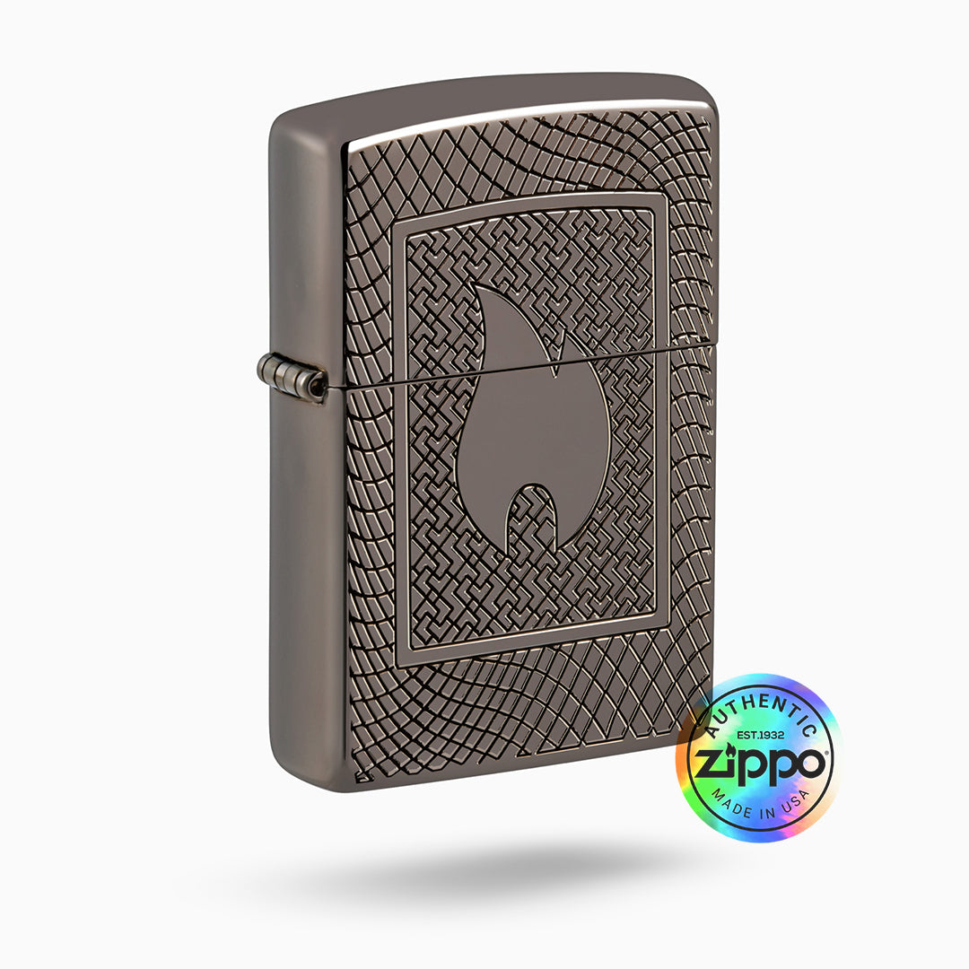 Immerse yourself in the fiery passion of our Flame Pattern Design. The iconic Zippo flame takes center stage on the striking ArmorĀ® High Polish Black lighter, encased in a stunning Deep Carve engraving of intricate geometrics. Experience the unique texture and luxury of this timeless design.