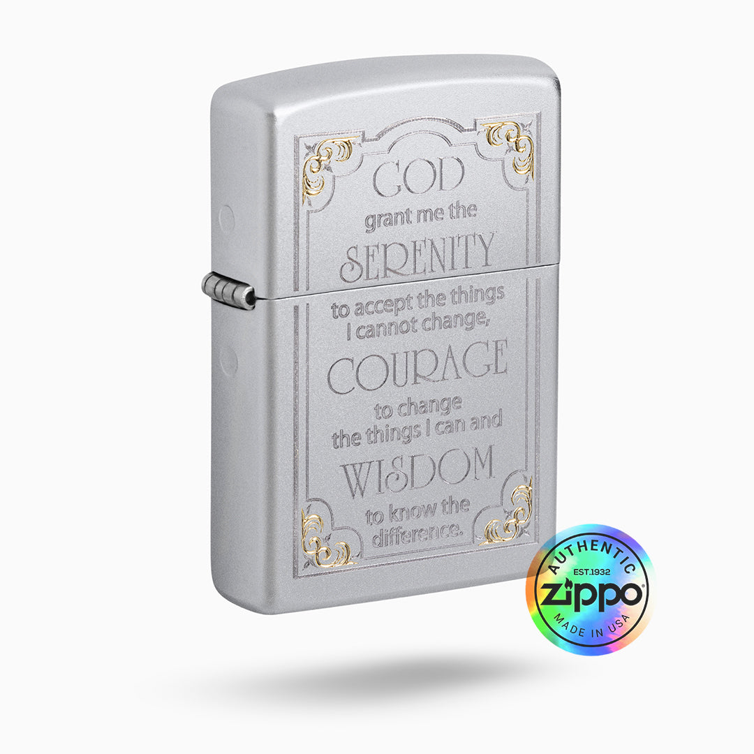 Find inspiration in the palm of your hand with the Zippo Serenity Prayer lighter. Crafted with windproof technology, this Satin Chrome™ lighter is engraved with the powerful Serenity Prayer. Let it remind you to embrace life’s ups and downs while living in the present moment.