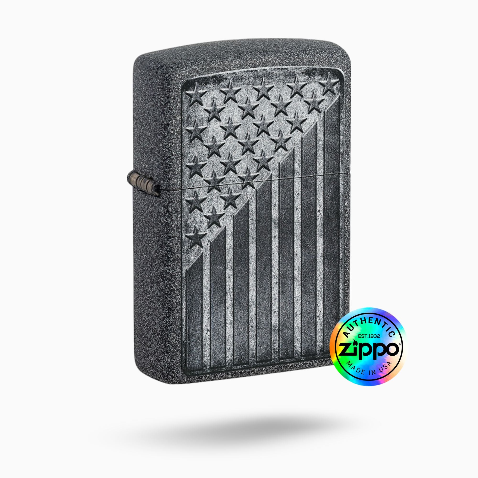 Show your patriotism with the Zippo Stars and Stripes Windproof Lighter. Featuring a rugged Iron Stone design that displays the American flag, this reliable lighter is perfect for everyday use. Make a statement and light up your fire with pride!