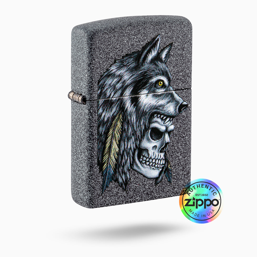 Inspired by nature, the Wolf Skull Feather Design Iron Stone lighter features a fierce skull and wolf design with a native touch. Zippo’s skilled artists created this original artwork using pen and ink, and then digitally transferred it to ensure every intricate detail is captured in the windproof lighter. Add a touch of boldness to your collection!